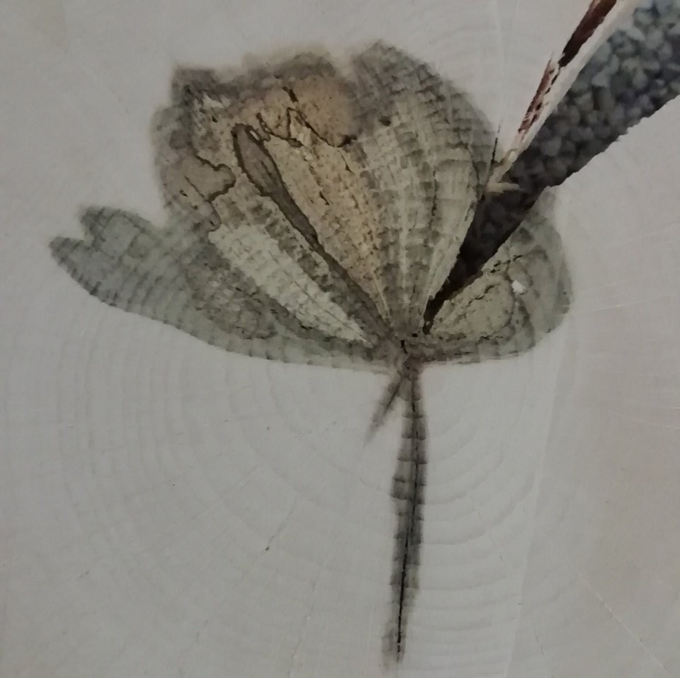 Rosen/Orchideenmotiv eingewachsen im Stamm.