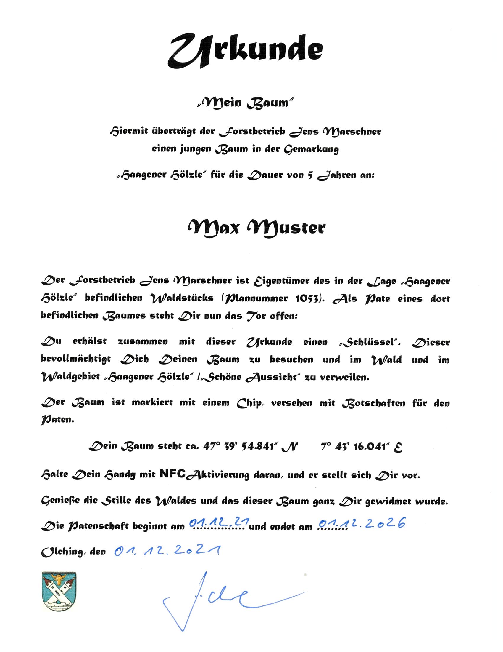 Baumpatenschaft mit Koordinaten eines bestimmten Gebiets, 10 Jahre Laufzeit mit Urkunde und Koordinaten.